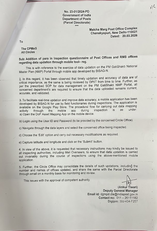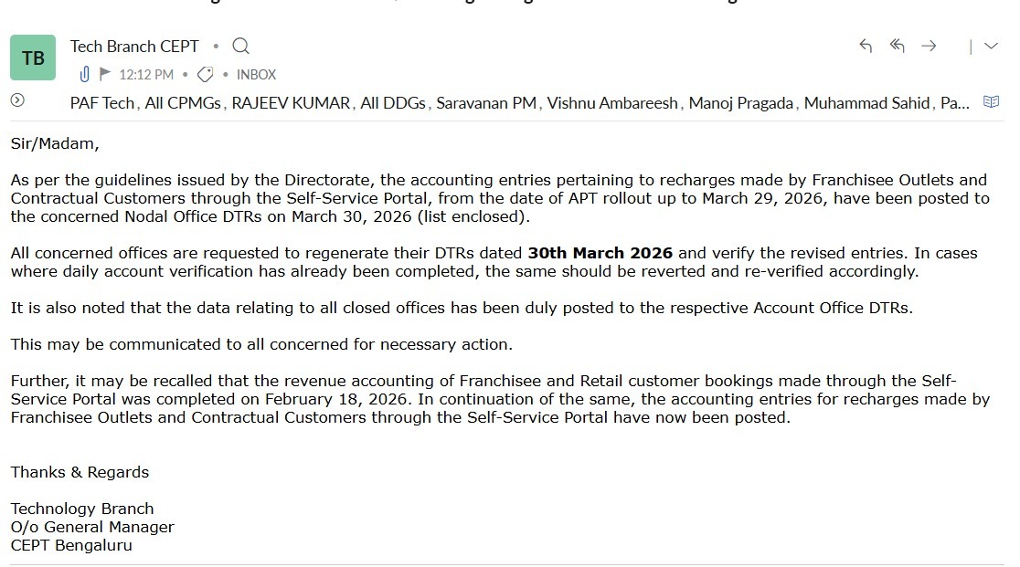 Sir/Madam, A front-end functionality for the creation of Post IDs at the Circle Office and Directorate levels has now been provisioned under the Post Management module. Earlier, this activity was being carried out by CEPT based on Support Desk tickets. In this regard, the detailed Standard Operating Procedure (SOP) for the creation of Post IDs at the Circle level is enclosed for reference and necessary action. Henceforth, creation of Post IDs to be handled at the Circle level itself. Accordingly, no Support Desk tickets pertaining to Post ID creation will be processed by CEPT. With Regards, рд╕рд╣рд╛рдпрдХ рдирд┐рд░реНрджреЗрд╢рдХ (рдкреНрд░реМрдзреНрдпреЛрдЧрд┐рдХ) / Assistant Director (Technology) рдореБрдЦреНрдп рдкреКрд╕реНрдЯрдорд╛рд╕реНрдЯрд░ рдЬрдирд░рд▓ рдХрд╛ рдХрд╛рд░реНрдпрд╛рд▓рдп / O/o Chief Postmaster-General, рдХрд░реНрдирд╛рдЯрдХ рдкрд░рд┐рдордиреНрдбреНрд▓, рдмреЗрдиреНрдЧрд▓реВрд░реБ - релремреж режрежрез / Karnataka Circle, Bengaluru - 560 001