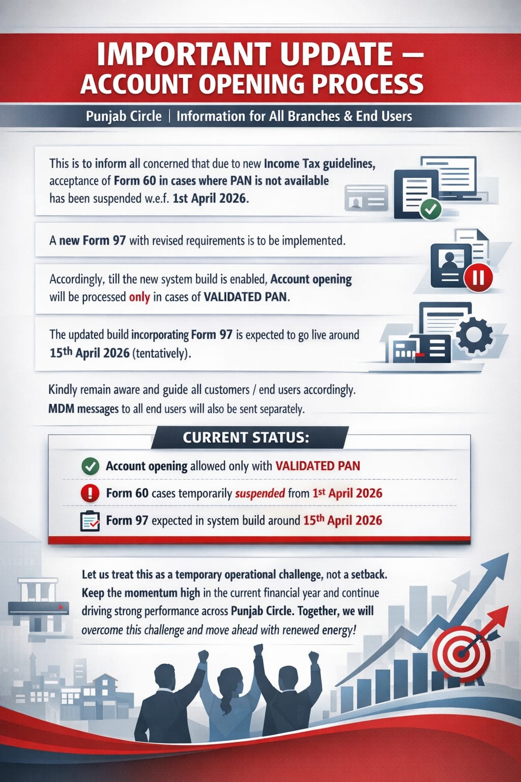 Dear Team, This is to inform you all that due to new Income Tax guidelines, accepting form 60 in lieu of PAN not available cases has been suspended from 1st April, 2026. Now form 97 with new requirements has to be implemented. So currently account opening in case of validated PANs only will be started from today evening. The new build with form 97 will start by 15th, April hopefullyтАж. Best wishes. MDM messages to all end users will be sent.