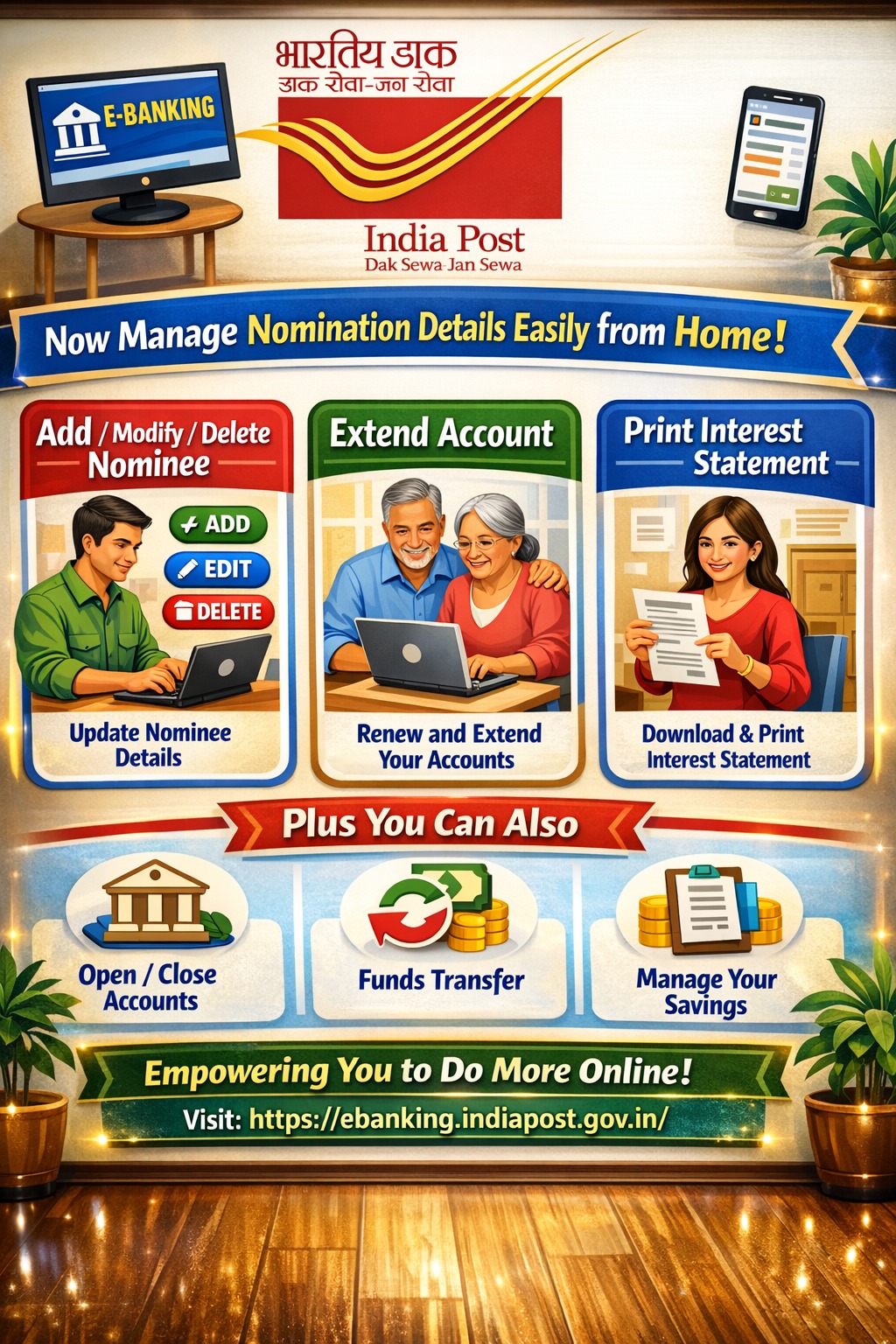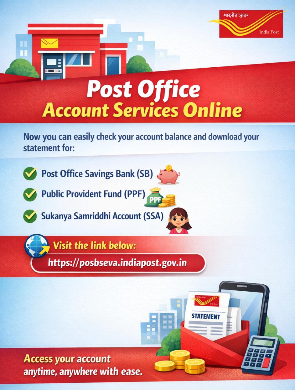 ЁЯУв *New рд╕реБрд╡рд┐рдзрд╛ by India Post for Customers* Now no need to visit the post office to check your savings! ЁЯЩМ You can easily: тЬЕ Check balance of your *SB (Savings Account), PPF, and Sukanya Samriddhi Account (SSA)* тЬЕ Download your account statement anytime, anywhere ЁЯУД. All this can be done online from *your mobile or computer*ЁЯТ╗ЁЯУ▒ ЁЯФЧ Access here: https://posbseva.indiapost.gov.in ЁЯТб *A step towards smarter, faster, and hassle-free banking experience* e Passbook Facility