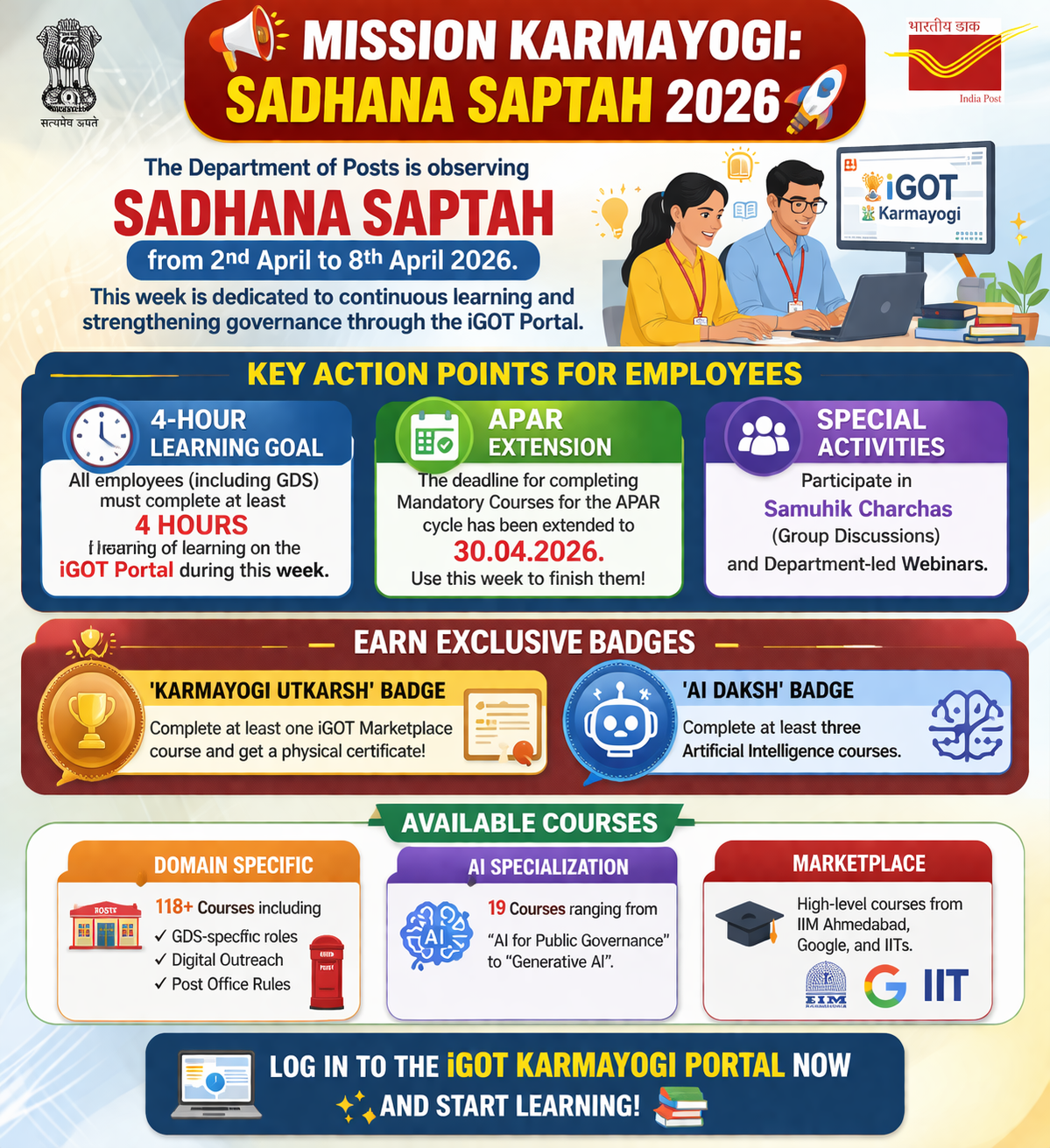 Mission Karmayogi - S─АDHANA Saptah from 2nd to 8th April: *Explore iGOT recommended courses for Sadhana Saptah 2026!* Sadhana Saptah 2026, to be observed from 2nd to 8th April 2026. A curated list of courses is provided in the attached PDF for your reference. All government employees are encouraged to: тАв Download the iGOT Karmayogi App тАв Complete any one Marketplace course during or before the week to earn the тАШKarmayogi UtkarshтАЩ Badge and a digital certificate тАв Complete at least three AI courses from тАШAI Daksh ProgramтАЩ to earn the тАШAI DakshтАЩ Badge тАв Complete a minimum of 4 hours of learning during the week *Kindly circulate this message within your learner community to promote wider participation.* _Let us learn, grow, and contribute towards building a Viksit Bharat._